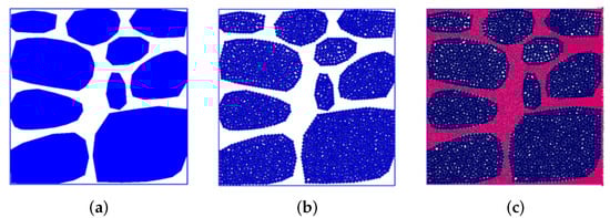 Stone masonry wall 2D-PM model generation procedure. (a) Masonry wall; (b) Stone unit particle assembly; (c) Mortar particle assembly.
