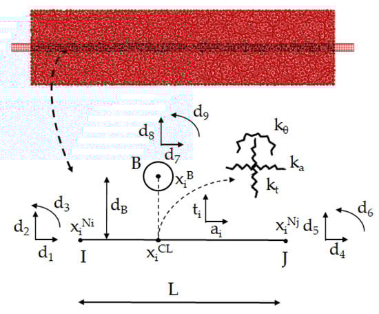 where is the contact interface velocity, and is the velocity of the entity at the contact interface. The velocity of particle B at the contact interface is defined through the traditional DEM formulation [25]. The velocity of the plane frame element at the contact interface follows the formulation proposed in [25]. For a given node h, the nodal translational velocities in the plane frame element reference axes are defined using Expressions (13) and (14):