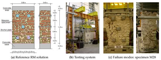 Setup for compression tests of the RM wall specimens and final failure modes [6]. (a) Schematic representation of the reinforcement solution with steel connectors (Specimens M41, M44, and M28); (b) axial compression testing system; and (c) frontal and lateral views of the failure mode of specimen M28. See [2,6] for more details.