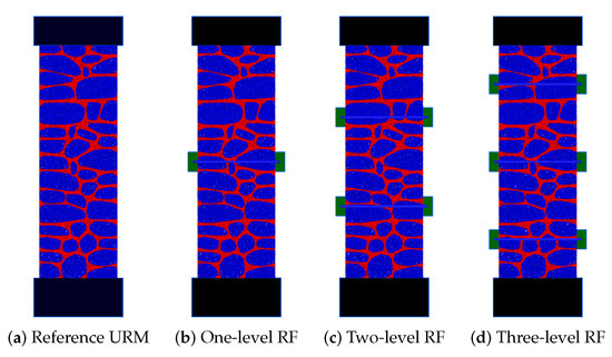 Figure 5 presents the 2D-PM and 2D-PMR models developed from the lateral faces of the unreinforced (URM) [24] and reinforced (RM) rubble stone masonry walls. Note that the 2D-PMR models representing the one- and two-level strengthening scheme will later be used in the parametric analyses.