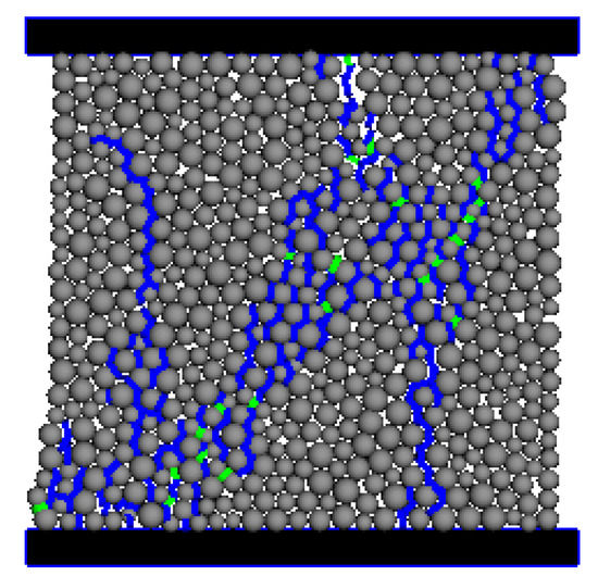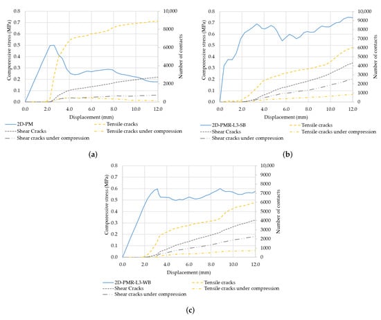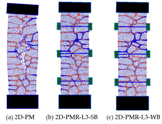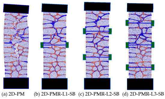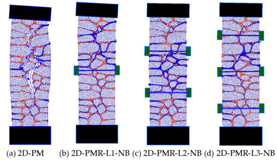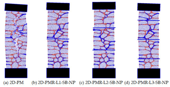 Figure 15 shows the damage evolution throughout the uniaxial compression test for the 2D-PMR numerical models with a strong bond and without a bond for a two-level reinforcement scheme.