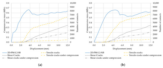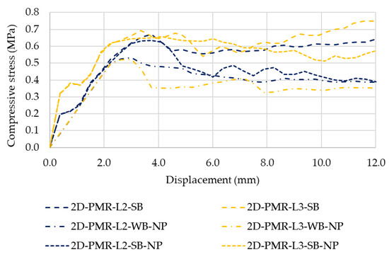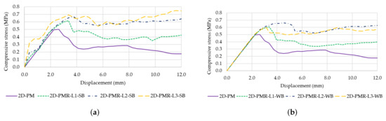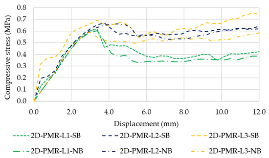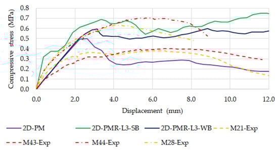 The stress–displacement curves obtained for the 2D-PMR numerical models, considering a strong bond (SB) and no bond (NB), are presented in Figure 14.