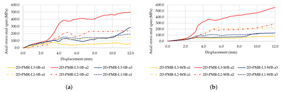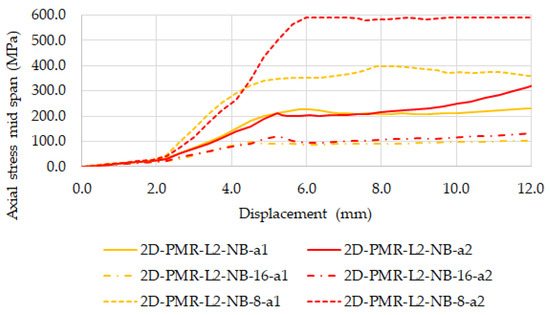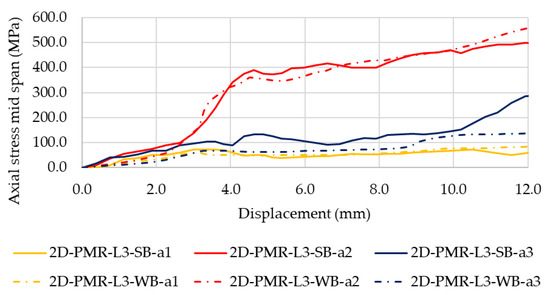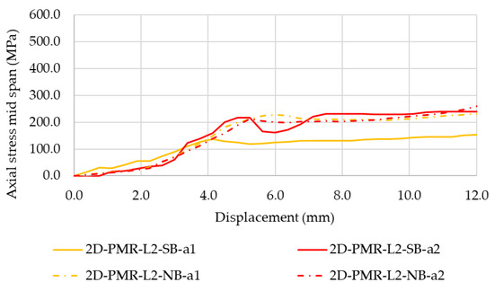 Figure 16 presents the axial stress evolution at the mid-span of the steel connectors for the two-level strengthening scheme, MP-2DR models, for both the strong bond and no-bond cases. Similar results were found for the one-level and three-level strengthening schemes. As shown, the MP-2DR models predict a similar response without a bond as with a strong bond approach. Notably, in the 2D-PMR model with a two-level scheme without a bond, the axial stress evolution at both levels is more symmetric than with a strong bond approach.