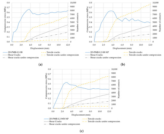 Stress–displacement diagram and crack evolution for the 2D-PMR models with and without plates for strong and weak bond approaches. (a) 2D-PM-L2-SB; (b) 2D-PM-L2-SB-NP; (c) 2D-PM-L2-WB-NP.
