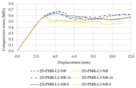 Figure 21 presents the stress–displacement curves obtained for the 2D-PMR numerical models with a three-level reinforcement solution without a bond and considering different connector diameters: 12 mm diameter (2D-PM-L3-NB), 16 mm diameter (2D-PM-L3-NB-16), and 8 mm diameter (2D-PM-L3-NB-8). As shown, the diameter range that is numerically assessed has little influence on the predicted response. As expected, the highest peak strength and ductility under uniaxial compression were predicted with the MP-2DR model with the largest diameter, but the overall response obtained with the smallest diameter is very similar.