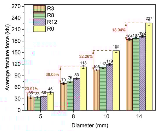 Figure 6 shows the average fracture force histogram of these specimens. As seen in the figures, when compared with the unbent specimens R0, the fracture force of the specimens with the bending radius of 3 m decreased by 23.91%, 38.05%, 32.26%, and 18.94%, respectively. In addition, the fracture force of CFRP tendons with the same diameter increased as the bending radius increased. The test results suggest that the fracture force of CFRP tendons was significantly reduced due to bending. In addition, the fracture force of R3D5 (35 kN) exceeded that of R8D5 (33 kN) and R12D5 (36 kN). The abnormal data can be interpreted as follows: the failure position was related to material defect, loading position, stress concentrations, and steel pipe port effect; the ultimate tensile force of the CFRP tendon with a diameter of 5 mm was low, and it had large discreteness.