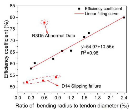 Figure 7 shows the relationship between the efficiency coefficient and the ratio of the bending radius to the tendon diameter. It can be seen that the efficiency coefficient is linearly related to the ratio of bending radius to the tendon diameter, except the slipping failure of the specimens with a 14 mm CFRP tendon. Moreover, combined with the failure modes of the specimens, it was observed that the ratio of the bending radius to the tendon diameter was below 2.4, the efficiency coefficient was less than 80%, and the failure modes of the specimens were mostly shear failure. Therefore, it is suggested that the ratio of the bending radius to the tendon diameter should be more than 2.4 in engineering practice.