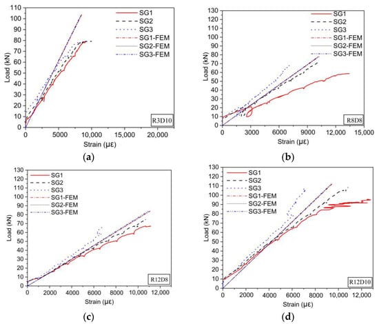 Figure 9 shows the load–strain curves of typical specimens investigated experimentally and numerically, drawn only before the fracture load. CFRP tendons with a diameter of 8, 10, and 14 m were selected as the research objects, and the rest of the specimens had the same trend of change. CFRP tendons did not reach their total capacity due to bending. From the strain values, the loading end had the maximum deformability. At the same time, most load–strain curves showed linear behavior. The same trend was also observed from the numerical simulation results, and the values were very close. The strain dispersion for the CFRP tendons was not significant during the lower loading stage (before 20% ), and it increased with the load after that. As the load increased, significant nonlinear segments appeared at the end part of the load–strain curves of some specimens. This is because as the load increased, cracks appeared on the surface of the CFRP tendon, which may lead to the deviation in the strain gauge direction from the longitudinal direction of the tendon. Han et al. [30] pointed out that this kind of nonlinear segment was the typical characteristic of the splitting failure for the unidirectional-fiber-reinforced composites. In addition, a spiral curve appeared at the lower loading stage of specimen R8D8 due to the long continuous loading time in the experiment; thus, it may lead to anchorage loosening or jack oil leakage in a short time. For specimen R12D10, SG1 changed significantly when the load exceeded 90 kN. This is because many cracks appeared, and the screwed wires lost their mutual constraint, leading the CFRP tendon to burst into multiple strands.