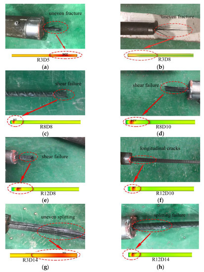 Failure mode of typical specimens: (a) R3D5; (b) R3D8; (c) R8D8; (d) R8D10; (e) R12D8; (f) R12D10; (g) R3D14; (h) R12D14.