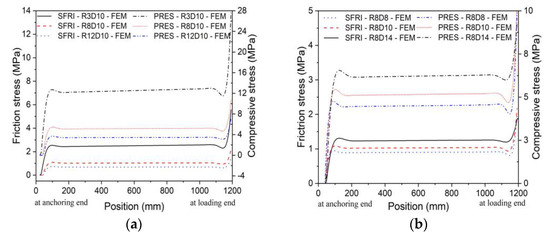 Friction stress and contact compressive stress distributions of CFRP tendons: (a) D10; (b) R8.