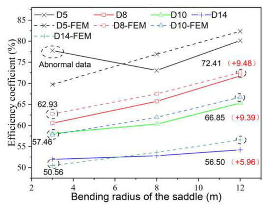 The efficiency coefficient of the FE models was compared with the corresponding test results to validate the reliability of the FE models. Table 4 lists the results for each group of specimens in the static load tests and FE analysis. The results suggest that the simulated values of the efficiency coefficient for four bending radii agreed well with the corresponding test results; in addition to the abnormal data, the maximum value of deviation (δ) was less than 6.0%. Therefore, it can be concluded that the established FE models are reliable.