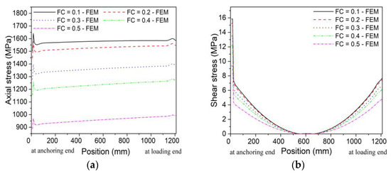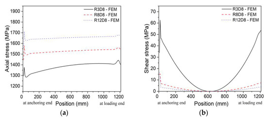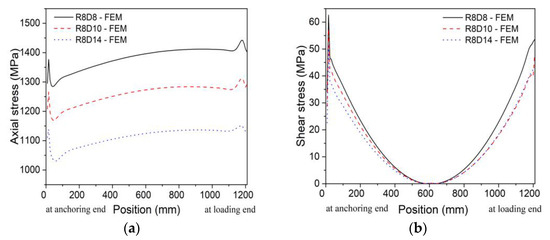Figure 16 shows the effect of diameter on the axial stress and shear stress distributions of CFRP tendons in FE analysis. As the diameter decreased, the axial stress increased significantly, indicating that CFRP tendons with a smaller diameter were more likely to provide the advantages of CFRP composites. The trend of the three curves in Figure 16a was consistent due to the uniform distribution of axial stress. Although the change in diameter had little effect on the shear stress, CFRP tendons still presented shear stress concentrations at both ends.