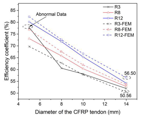 Figure 15 compares the efficiency coefficient of CFRP tendons with different diameters simulated by FE analysis with the test results. In addition to the abnormal data, as the diameter of CFRP tendons increased, the efficiency coefficient of all specimens decreased significantly. When the diameter of CFRP tendons reached 14 mm, the corresponding efficiency coefficients of R3 and R12 were 50.56% and 56.50%, respectively, which were very low. The results show that increasing the diameter of CFRP tendons had a significant adverse effect on performance.