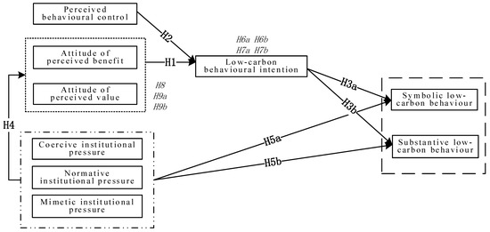 Bansal et al. [44] suggest that corporate perceptions of external institutional pressure first influence their own perceptions of LCB, and then shape their rational motivations and actual behavior accordingly. Stronger institutional pressure can help improve contractors’ perception of low-carbon values. Conversely, it can create a lack of legitimacy, leading corporate to avoid taking social responsibility and manipulating the institutional environment [22]. As government regulations and social norms become more stringent, construction companies are becoming aware that adhering to low-carbon standards will enable them to better survive and thrive in the organizational arena and get a head start on low-carbon issues. Therefore, the stronger the external institutional pressure, the more positive the attitude towards LCB of contractors, the stronger the incentive to align with external requirements, and then greater the incentive for actual LCB to emerge. Accordingly, the following hypotheses are formulated.