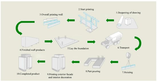 In the building printing phase, AM technology can either print on-site or on print walls and then assemble them. Figure 1 shows the process of printing and assembling an AM building. AM construction can be divided into two types. The first type is on-site printing, which involves directly printing the building on the construction site or in a factory. The second type involves printing the components in a factory and then transporting them to the site for assembly. Figure 1 shows the second type of AM construction. On-site printing does not require steps 7 to 10. The components are first printed in a factory, and after the foundations are completed on the construction site, they are transported to the construction site for assembly, followed by the partial pouring of concrete and finally finishing the façade, a process that is similar to the construction of an assembled building. Pipes, windows, reinforcement, etc., are pre-positioned at the design stage, and reinforcement is added to the hollow sections of the elements prior to the secondary pouring to increase the overall strength and tensile properties of the wall, or different insulation or soundproofing materials can be added to reduce weight and achieve different functions [].
