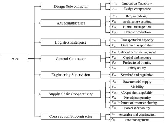 There is relatively little research on evaluation metrics for AM construction supply chains []. The reference documents are mainly from studies on the traditional construction industry and manufacturing supply chains. In establishing the SCR evaluation indicator system, the evaluation indicator system is established from the perspective of the entire life cycle of AM buildings, taking into account the case and the impact of the industrial chain on the supply chain in the previous section.