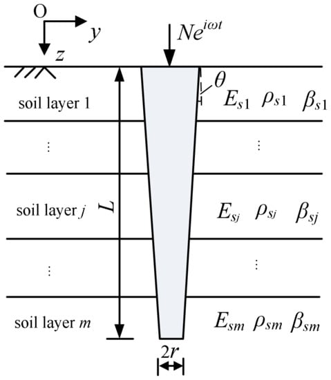 - The soil has m layers, and each layer is isotropic and homogeneous. Young’s modulus, density, damping ratio, and shear wave velocity of each soil layer are Esi, ρsi, βsi, and Vsi for the i-th section, respectively, and soil nonlinearity is neglected. The ground surface is free of normal and shear forces.