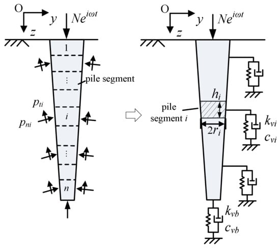 In the following, a tapered pile divided into n frustum segments is considered. The tapered pile is subjected to a vertical harmonic load at the pile head and shear force pti and normal force pni (I = 1~n) along the tapered pile segment shaft, as shown in Figure 2. The thickness and radius of the i-th segment are assumed to be hi and ri, respectively. The tapered pile is divided into segments of the same thicknesses as the adjacent soil layers. The soil segment surrounding the pile is idealized as distributed complex springs to model its resistance to the pile. The frequency-dependent dynamic stiffness and damping of the complex springs, kvi and cvi, account for the soil stiffness and energy loss due to wave propagation and hysteretic dissipation. The vertical spring kvb and dashpot cvb are used to simulate soil resistance at the pile tip. A dynamic Winkler model is then developed, incorporating the distributed complex springs along the pile shaft and below the pile tip, as illustrated in Figure 2.