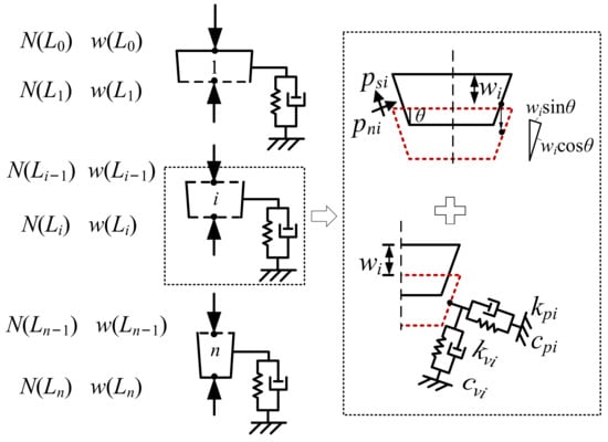 Under vertical vibration, pti and pni are functions of the complex stiffness and displacement along the normal and tangential force directions and can be expressed based on the Winkler model assumption as