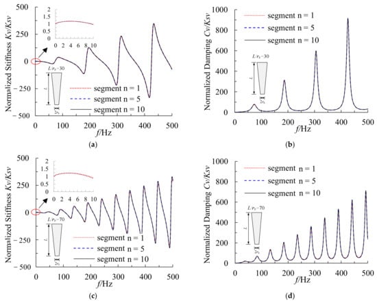 A clear oscillatory characteristic for both the stiffness and damping of the tapered pile is observed in Figure 6, and the oscillation is more obvious as the pile length increases. This phenomenon is the same as the longitudinal vibration response of the cylindrical rod []. Hence, the results from the proposed approach can be compared to the natural frequencies of the longitudinal vibration of a fixed-free cylindrical rod given by Thomson [] as