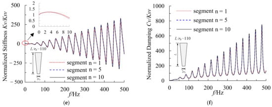 The pile slenderness ratio is a decisive factor in determining the number of pile segments. In the following analysis, the pile tip radius rb = 0.5 m is used along with slenderness ratios L/rb = 30, 70, and 110, which covers the common range of pile slenderness ratios in engineering practice. To illuminate the effect of the tapered pile parameters on its dynamic characteristics, the soil surrounding the pile is assumed to be homogeneous with elastic modulus and mass density of 30 MPa and 1600 kg/m3, respectively. The same physical parameters used in Kaynia [] are adopted in the analysis: the pile-to-soil elastic modulus ratio Ep/Es = 1000, soil-to-pile mass density ρs/ρp = 0.7, and soil damping ratio β = 5%, taper angle θ = 1°. Figure 6 displays the variation of calculated normalized vertical stiffness Kv and damping Cvin Equation (25) with loading frequency. In Figure 6, Ksv is the static stiffness of the tapered pile. To better employ tapered piles for improving the performance of high-speed railway subgrades, the range of frequency of ground-borne vibration from 20 to 300 Hz is of concern []. Therefore, the dynamic response of the tapered pile is calculated within that frequency range (0–400 Hz).