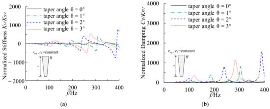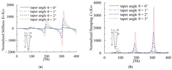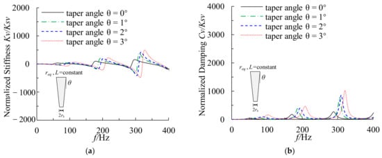 Effect of the taper angle on the vertical dynamic impedance of the tapered pile with slenderness ratio L/rb of 30: (a) stiffness; (b) damping.