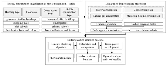 To achieve the dual carbon goal in China’s building sector, a plan is being considered to expand the emissions trading scheme from the industry sector to the building sector, which offers a high CO2 emission reduction effect. To scale up the scheme more effectively, it is very important to establish a reasonable CO2 emission baseline for public buildings. However, cities in the cold regions of northern China, represented by Tianjin, have yet to have a clear carbon emissions baseline for public buildings. Conducting research on this topic often faces difficulties in obtaining a large amount of real data. In addition, previous studies have paid little attention to the dynamic changes of carbon emissions in Tianjin in the case of future energy decarbonization. This study investigated the basic information of 721 public buildings in Tianjin, such as power consumption per unit area, gas consumption, central heating energy consumption, building area, and year of construction, covering eight types of public buildings. The distribution of energy consumption and the intensity of carbon emissions in public buildings were analyzed, and the correlation between the building area, the building construction year, and carbon emissions per unit area was also made. Subsequently, the advanced value, guiding value, and constraint value of the carbon emission baseline in Tianjin were formulated, and the dynamic changes between 2020 and 2030 were analyzed. The framework of this study is shown in Figure 1.
