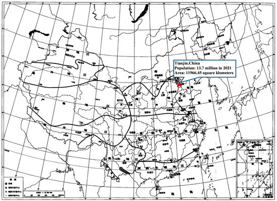 The study area is Tianjin, China, with a population of 13.7 million in 2021. This is a typical city in China’s cold climate zone, as shown in Figure 2. The average annual temperature in Tianjin is about 14 °C. The hottest month is July, with an average monthly temperature of 28 °C; January is the coldest month with an average monthly temperature of −2 °C. There are a large number of public buildings in the city, including office buildings, commercial buildings, school buildings, etc., which provide data sources for the study.