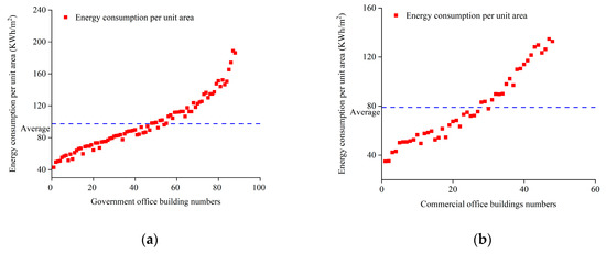 Buildings that were functioning normally and with complete data records (at least one year or more) in recent years were selected as a survey sample. Moreover, if the building is retrofitted for energy efficiency, only the operational energy consumption of the retrofitted building will be recorded. The number of samples of different building types is basically consistent with the proportion of building types in Tianjin, namely, office buildings (40%), shopping malls (30%), hotels (11%), and schools (19%).