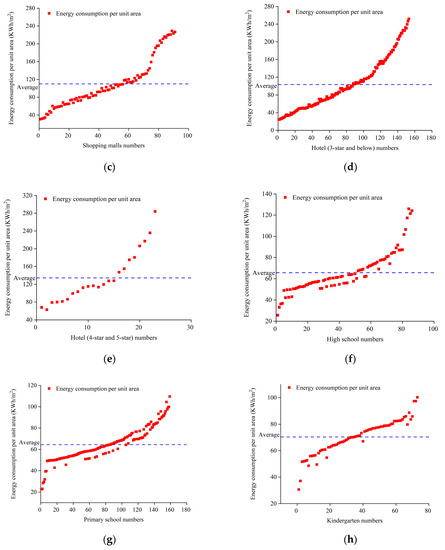 The level of energy consumption is shown in Figure 3. The average energy consumption for the three types of schools was 66.82 kWh/m2, which makes it the lowest of all the building types examined. In contrast, hotels have the highest average energy consumption of 118.88 kWh/m2. Energy consumption in 4-star and 5-star hotels is 30% higher than that in 3-star (and below) hotels. Overall, energy consumption in buildings is as follows: star hotels > shopping malls > office buildings > schools.
