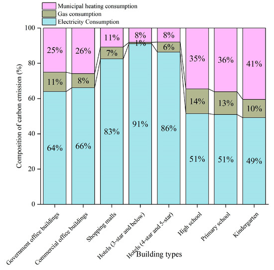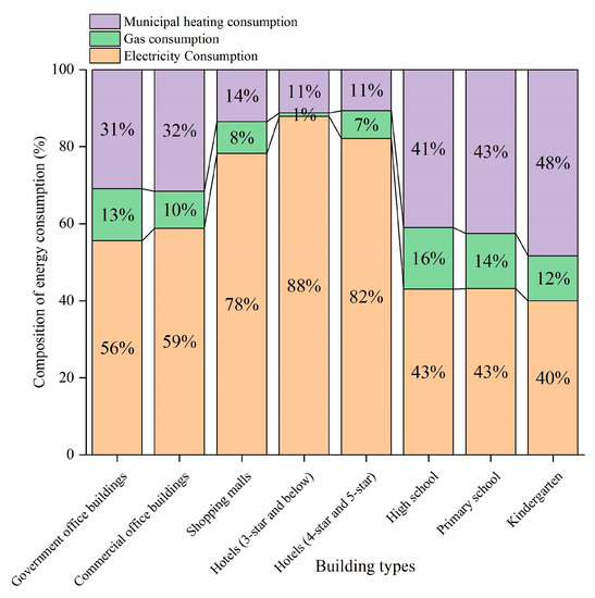 The composition of energy consumption (electricity, natural gas, and municipal heat) in public buildings in Tianjin is shown in Figure 4. Except for schools, the electricity consumption of other types of public buildings accounts for more than 50% of the total energy consumption, while in star-rated hotels exceeds 80%. All three types of schools use the largest share of municipal heat, an average of 45%. On the other hand, natural gas contributes the smallest share of energy consumption, with less than 20% for all building types.