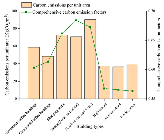 Compared with previous studies in other Chinese cities and provinces such as Beijing [37], Shanghai [37], Hong Kong [38,39], and Taiwan [15], the carbon emissions per unit area of buildings are lower in this study, reflecting a better low-carbon performance of public buildings in Tianjin. This phenomenon is closely related to the development of energy-saving and low-carbon building policies in Tianjin in recent years. For example, energy conservation efforts in public buildings in Tianjin began in 2005, and mandatory energy conservation standards (Tianjin Design Standard for Energy Efficiency of Public Buildings DB 29-153) were revised in 2010 and 2014, respectively. In addition, for existing public buildings, Tianjin has joined the list of key cities to improve energy efficiency, implementing energy-saving retrofit of nearly 10 million m2 of public buildings. Furthermore, coal substitution has been implemented in recent years. The comprehensive implementation of the above measures brings enormous advantages for energy conservation and carbon emission reduction in public buildings in Tianjin compared to other provinces and cities.