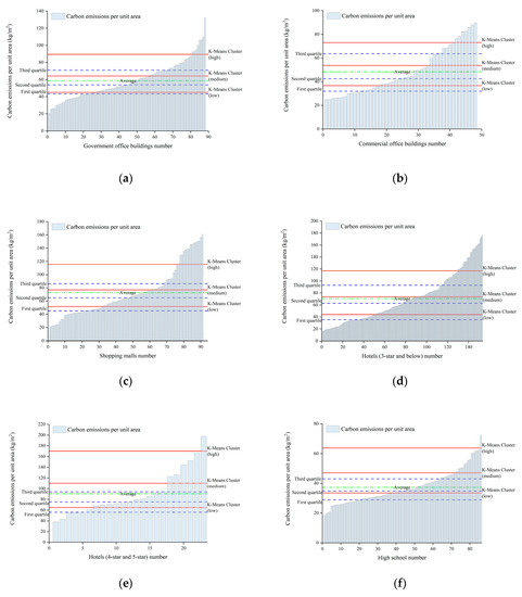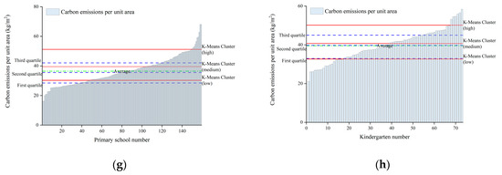 The baselines of carbon emissions from public buildings for the two calculation methods are shown in Figure 7. Due to the high carbon emissions of some buildings, the baseline for carbon emissions provided by the K-means clustering algorithm is typically higher compared to the Quartile method. Taking the constraint value of carbon emission baseline as an example, the unsatisfactory rates of existing government office buildings, commercial office buildings, shopping malls, 3-star (and below) hotels, 4-star and 5-star hotels, high schools, primary schools, and kindergartens are 9.09%, 16.67%, 16.48%, 15.69%, 4.35%, 1.16%, 6.92%, and 8.22%, respectively. Except for kindergartens, advanced baseline carbon values for all building types are above the first quartile line. In summary, for the smooth promotion of carbon neutrality and peak carbon value, it is recommended to use the Quartile method as the baseline method, using the results of the first, second, and third quartiles as the advanced, guiding, and constraint values for the carbon baseline in Tianjin.
