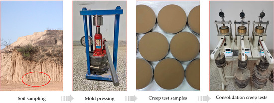 The remainder of the paper is organized as follows. Section 2 describes the repetitive tests of the creep behavior of loess. Section 3 discussed the test results. Section 4 introduced a conversion method that unifies the test data of different loading modes of creep tests. In Section 5, a randomness analysis for creep model parameters based on the test data was conducted. In Section 6, a non-deterministic prediction method for post-construction settlement of loess high-fill embankments was proposed and verified through engineering application. Finally, in Section 7, conclusions are provided.