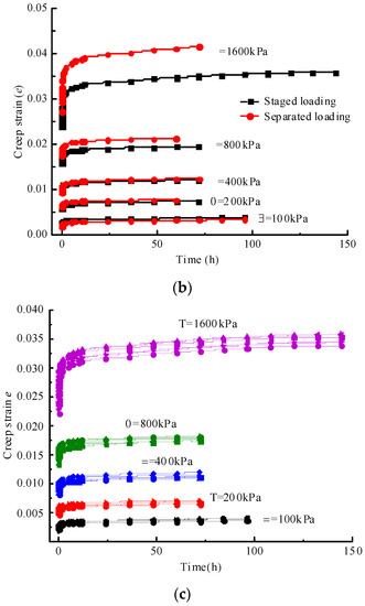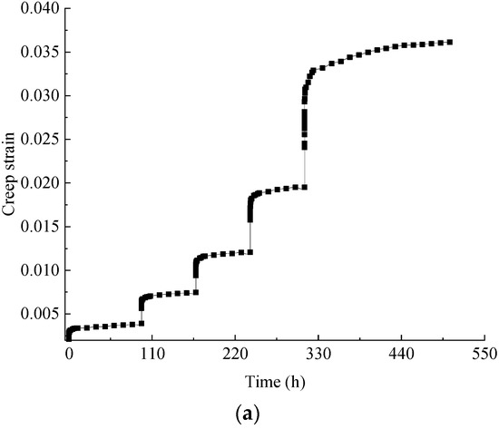 where is the creep strain of staged loading mode while is that of separated loading mode. Using Equation (8), the creep test results from staged loading can be translated into separated loading.
