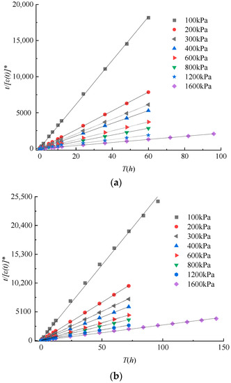 Firstly, an empirical fitting model was employed to analyze the test results. The fitting process was performed with software ORIGIN (version 2019b). The least square method and Levenberg–Marquardt algorithm were used for the linear and power function fitting described below, respectively. Using the average data of the two loading modes, the relationship between and t was fitted using the linear function (Equation (1)). Fitting results are shown in Figure 4. To increase the fitting precision, extra tests considering the loading level at 300 kPa, 600 kPa and 1200 kPa were conducted and analyzed in this section. It can be seen from Figure 4 that the relationship between and t is clearly linear for all loading levels and both loading modes.