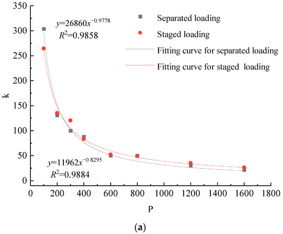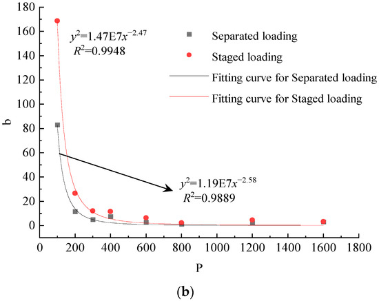 The relationship between the fitting parameters k and b with the loading P is shown in Figure 5a,b, respectively. Fitting results show a strong exponential relation (with correlation coefficient bigger than 0.985) between k, b and loading level P, indicating a convergence trend for the slope and intercept for -t. The slope tends to converge at 25 when P is big enough (Figure 5a), while the intercept approaches 0 with the growth of P. Their relationship can be expressed as a power function as shown in Equation (4):