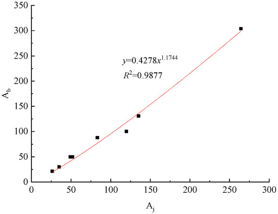 Based on the obtained empirical creep model, slopes of the relation curve of and t for separated loading and staged loading were denoted by Ab and Aj. The relationship between Ab and Aj under different loading levels was shown in Figure 6. The relationship between Ab and Aj can be expressed as a power function as follows: