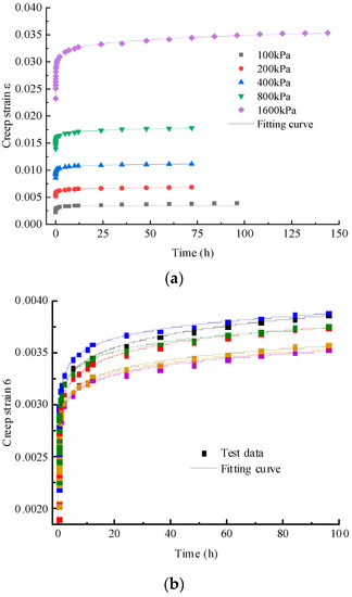 As for the repetitive results, Figure 3c shows that under different loading levels, creep deformation exhibited evident randomness. Loading level has a positive correlation with the randomness of creep deformation. This is not surprising since a greater magnitude tends to cause a bigger possible error. In other words, with the same error rate, data with bigger magnitude show more obvious fluctuation. It should be noted that the repetitive tests were conducted by the same skilled test operator under the guidance of the standard test procedure and on a well-functioning test device. However, the test results still differ greatly among different test samples. The test errors that cause this randomness are due to the nonuniformity of the disturbed soil, sample preparation error (including the error of water content and dry density), measurement error and manual error (no matter how skillful the tester is). These errors can be reduced by following the standard operating procedure or by using a more sophisticated device but can never be completely eliminated. Therefore, when using the test data to predict the possible creep deformation for practical engineering, this randomness must be considered, and a non-deterministic predication should be conducted instead a deterministic one. Moreover, repetitive intensity also influences the result, which should be considered in engineering application.