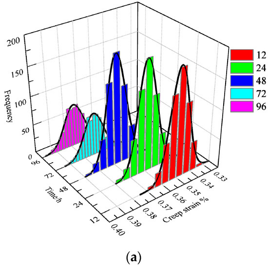 Through unbiased estimation method, mean value and covariance of the statistical population were approximated by those of the samples. MATLAB R2020a was used to calculate the mean value vector , scatter matrix A and covariance matrix S. The built-in function mvnrnd was used to generate six hundred groups of model parameters for demonstration. Using the acquired parameters, six hundred groups of creep strain at different times can be calculated. After a statistical analysis of the calculated creep strain, the distribution property of the creep strain at different times can be obtained as shown in Figure 8. The calculated creep strain also obeys the normal distribution model. The distribution property for different load levels at a certain time was shown in Table 4.