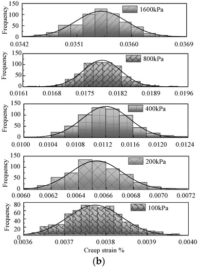 Test results were statistically analyzed in this section. Furthermore, a modified merchant model will be established in Section 4, and a parameters randomness analysis will also be conducted to quantitatively descript the statistical feature of the creep behavior of compacted loess. Figure 3a,b shows the typical relationship curve between creep strain and time under two different loading modes. Figure 2a is the unprocessed-graded loading results, Figure 2b is the comparison of graded loading and separate loading which shows the difference between two loading mode. The conversion equation was proposed accordingly. It can be observed from the figures that under separated loading, creep deformation increases rapidly with the applied load and converges over time. Under staged loading, the creep deformation changes step by step with the applied loads. The samples all went through three stages: a transient deformation stage, deceleration creep stage and stable creep stage. The soil experienced structural damage and reorganization during the creep process. The initial structure was damaged due to the load, and creep deformation became stable due to the completion of soil reorganization at a later creep period. The Boltzmann superposition principle [41] was used to translate the results of the staged loading to a separated form for comparison as shown in Figure 3b. It can be observed that, at all loading levels except 100 kPa, creep deformation obtained by the separated loading mode is greater than those of the staged loading mode, especially at 1600 kPa. The error of the translation accumulated with the growth of the loading level. The translated curve tends to be bigger than the original result of separated loading because the staged loading takes more time and tends to produce bigger deformation as the loading level increases. Theoretically, the results of separated loading and translated staged loading at 100 kPa should be identical since no translation is performed at this level. The obtained separated loading result is slightly smaller which is merely caused by test error. Since both loading modes are commonly used in practical engineering, it is necessary to set up a bridge between the two modes so that diverse types of data can both be used in the statistical analysis. This work will be discussed in Section 4.