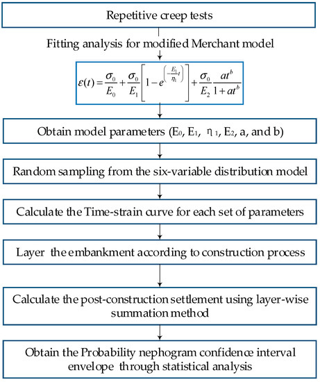 Randomness of the creep behavior of compacted loess and other kinds of soils is inevitable. Therefore, it is necessary to consider such randomness in the long-term deformation prediction process for geo-structures such as soil embankments. Based on the modified Merchant model described above, a non-deterministic predication method for post-construction settlement of a loess fill embankment was proposed. As illustrated in Figure 9, the non-deterministic predication method starts with a group of repetitive creep tests that was designed to acquire the random feature of the creep behavior. Then, parameters of the modified Merchant model fitting curve for the test data were obtained through statistical analysis. In this paper, it was assumed that the parameters obey a six-variable normal distribution, and a built-in function mvnrnd of MATLAB was used to randomly generate separate groups of creep parameter values. The time–strain curve for each parameter combination was calculated by substituting the parameter to the modified Merchant model. Then, based on a layer-wise summation method, by proportionally scaling the time–strain curve according to the thickness of each layer and accumulating the deformation of each layer, post-construction settlement of the filling embankment can be calculated. With a group of deformation curves acquired, statistical analysis was then applied to investigate the randomness of the post-construction settlement. The probability contour of the prediction value and the confidence interval envelope under different confidence levels can be obtained.