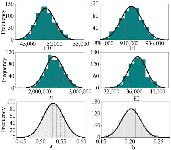 The fitting results demonstrate the superior performance of the modified Merchant model and show the significant variability of the model parameters. Based on the Kolmogorov–Smirnov test, a normal distribution model was chosen to describe the randomness of the parameters. In the modified Merchant model, controls the immediate settlement of soil structure. , , , a and b are the parameters that control the damping and stabilizing of the creep deformation. These six parameters are corelated and therefore were treated as a six-dimensional random model as shown in Equation (14):