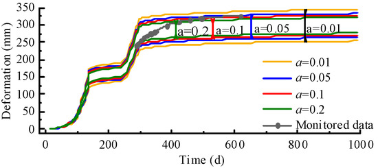 By statistically analyzing the distribution characteristics of the predicted deformations, a probability density function can be fitted at each moment. A contour plot of the probability density of deformation was then obtained and shown in Figure 12. The contour plot graphically illustrates the development of deformation in a non-deterministic way. Along the time axis, the deformation trend was shown, and at a specific moment, distribution characteristics of the deformation can be obtained. To further represent the possible deformation range, different deformation confidence intervals were calculated and shown in Figure 13. The monitored data fall within the confidence interval at a significant level of 0.1.