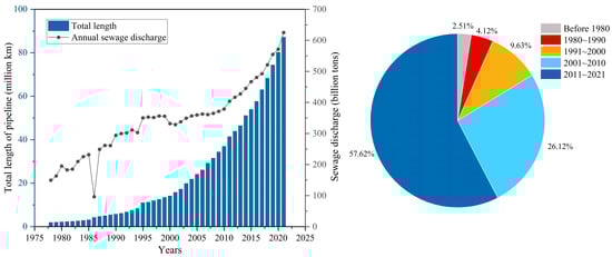 Chart of the growth of urban drainage pipe mileage and the distribution of service life in China.