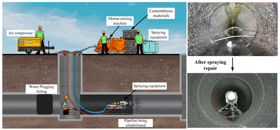 Trenchless rehabilitation and renewal technology has gained widespread usage in the rehabilitation of drainage pipes because of its economical and environmentally friendly nature [10,11]. Of these technologies, lining with sprayed cementitious materials is prevalent for the rehabilitation of various drainage pipes and culverts due to its flexible construction, rapid repair speed, superior structural performance, and resistance to corrosion. Lining with sprayed cementitious materials method is a rehabilitation method in which a fiber-reinforced cementitious composite for repair is uniformly coated on the inner surface of the host pipe to form a lined pipe by centrifugal or pressure spraying, as shown in Figure 2. This technology is more widely used in Europe and North American countries; in recent years, China has also started to use this technology for the spraying repair of drainage pipes, and has achieved better repair results [12,13,14,15]. At present, the main research related to spraying methods of cementitious materials concerns the development of new fiber-reinforced cementitious composites, and the study of the structural bearing capacity of the repaired structure [14,16,17,18,19].