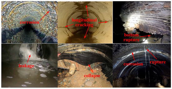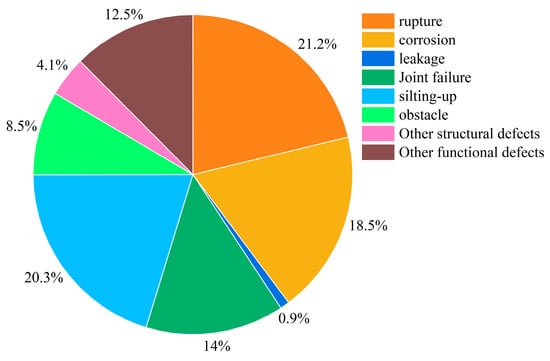 Buried drainage pipes are exposed to long-term dampness and sulfate erosion, and are subjected to soil loads around the pipe, groundwater pressure, traffic loads, etc., resulting in various defects to the pipe during operation. Defect detection and defect level determination before pipe rehabilitation are crucial to rehabilitation. The most commonly used pipes for drainage in China are reinforced concrete, high-density polyethylene, and polyvinyl chloride. According to current inspection results, common defects in concrete pipes are corrosion and rupture (including longitudinal and circumferential cracking) (Figure 3), as well as leakage, disconnection, and foreign body penetration, while defects such as rupture and collapse are mostly found in plastic-type flexible pipes [6,7]. In addition to the commonly used circular pipes, some arch-shaped and rectangular drainage culverts built with materials such as bricks, stones, and concrete were constructed in the early days of urban construction. These culverts have been in operation for a long time and exhibit more serious defects such as leakage, corrosion, and collapse [28,29,30]. Furthermore, drainage culverts are prone to accidents such as soil erosion and ground collapse due to their large cross-sectional dimensions. The percentage of concrete pipe defects in a domestic city is shown in Figure 4.