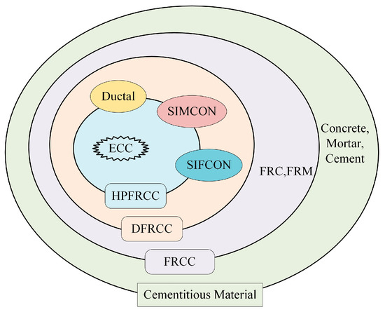 Matsumoto and Mihashi classified cementitious composites (Figure 7) and introduced the basic concepts and characteristics of various Ductile Fiber-Reinforced Cementitious Composites (DFRCC) [61]. Although the names of these materials are defined differently in each country, the basic design concepts are similar, and new cementitious composites with excellent properties are developed through composition and structural optimization design. Since the properties of ECC materials are very much in line with the needs of drainage pipe repair by spraying, more and more studies have been conducted in recent years on this material in drainage pipe repair, which is also the most promising material for spraying repair [17,62]. The following is an overview of this material in relation to its matrix material, reinforcing fibers, and the fiber–matrix interface structure.