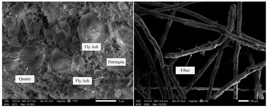 The volume fraction, orientation, shape, size, and properties of fibers, as well as the bonding characteristics between the matrix and fibers, are important factors that affect fiber-reinforced cementitious composites. They need to be considered in the design of lining materials [70,71]. PP, PE, and PVA fibers are the most commonly used reinforcing fibers for ECC materials. The elastic modulus of the PP fiber is lower, and its elongation at the break is greater than that of concrete. Its addition can improve the ductility of the material and has an important role in the bearing capacity after cracking. The elastic modulus and tensile strength of PE fiber are higher than those of PP and PVA fibers. The tensile performance of PE-ECC materials is much higher than that of composite materials with PP and PVA fibers. The performance parameters of cementitious composites reinforced with PP, PE, and PVA fibers are shown in Table 5 [72]. Fibers with a high elastic modulus are mainly used to improve the material’s impact resistance, tensile and flexural strength, stiffness, and anti-cracking performance, while fibers with a slightly lower elastic modulus are mainly used to improve the material’s toughness and strain capacity. Lai et al. studied the influence of PP fiber length and dosage on the flow performance of the material. The results showed that fiber length had a significant effect on the flowability of mortar within the range of 6–12 mm. The fiber dosage was negatively correlated with flowability, and the mass ratio of fiber dosage generally should not exceed 0.9%. The study also showed that mortar materials containing PP fibers can achieve good flowability with reasonable design proportions, which is beneficial for spray construction [73]. On the other hand, Pereira et al. studied the effect of fiber diameter on the initial cracking strength. Fibers with smaller diameters significantly improved the initial cracking strength of the material, while fibers with larger diameters often played a significant role only after cracks formed, showing more obvious tensile hardening characteristics [74]. The carbonation resistance of concrete is also an important factor affecting the durability of structures. Relevant tests have shown that when the length of PVA fiber is 6 mm and the fiber volume content is 0.75%, the improvement of the carbonation resistance of concrete is the strongest [75].