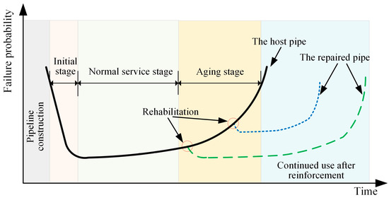 According to a previous study, the rehabilitation of drainage pipes with different degrees of defects can achieve different rehabilitation results. The probability of failure of buried pipes during service can be described according to the bathtub curve (Figure 10), which shows that the probability of failure of the original pipe increases gradually with an increase in service time; the probability of failure increases significantly beyond the normal service stage and the remaining bearing capacity becomes smaller and smaller. Choosing a reasonable time to repair, at or before the failure stage, is conducive to extending the service life of the pipeline. On the contrary, when the original pipeline has more serious damage, the repair requires a higher wall thickness and cannot make full use of the remaining bearing capacity of the existing pipeline and the ability of the two to work together, and the service life is not significantly improved.